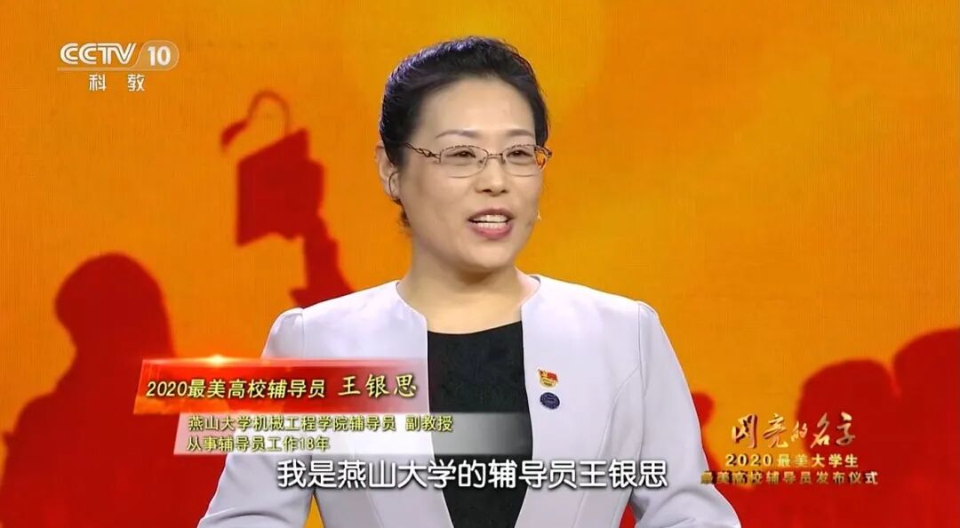 1月11日晚19:31,由中宣部、教育部、中央广播电视总台联合主办的《闪亮的名字——2020最美大学生/最美高校辅导员发布仪式》在央视科教频道黄金时段播出。王银思代表学校登上央视舞台,面向全国展示了燕山大学的学工风采与育人成效。