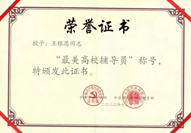 王银思此次获评为我校思政工作系统又新增一项国家级最高荣誉,是我校学生工作的又一标志性成果,更是我校乃至河北省辅导员队伍建设的历史性突破与纪录刷新。同时,“最美高校辅导员”是教育部第五轮学科评估的重要观测指标,此次入选实现了我校该项指标“0”的突破,为学校“双一流”建设和学科评估工作增添了浓墨重彩的一笔。我校将再接再厉,深入落实立德树人根本任务,持续推进辅导员队伍建设,大力培养选树新时代高校辅导员先进榜样,引导广大辅导员不忘初心、牢记使命,培养德智体美劳全面发展的社会主义建设者和接班人。