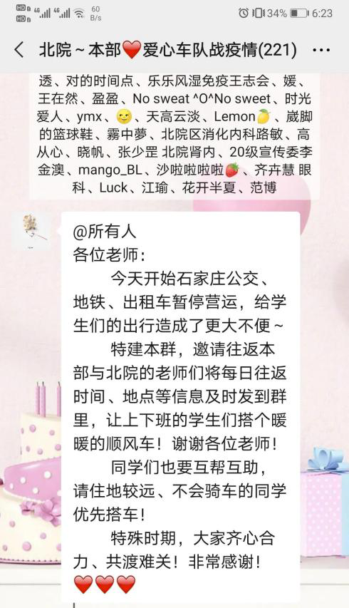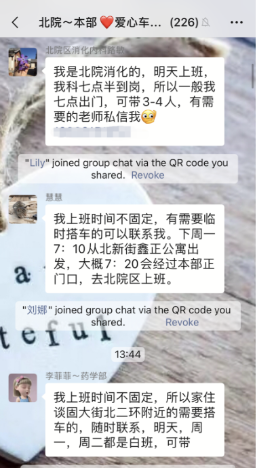 为减少人员流动,最大化地防止病毒传播,从1月9日起,石家庄全市地铁、公交、出租车、客运停止运营。寒风凛冽,交通不便,这对于全部在医院外租住的第二医院研究生来说,无疑更增加了困难。由于临床轮转的需要,很多研究生要辗转于医院本部、北院、东院区之间。第二医院在发现这一问题之后,立即组织医院老师组建爱心车队。老师们纷纷报名参加,利用私家车接送同学上下班,用顺风车传递爱心,为寒冷的冬日增添温暖。