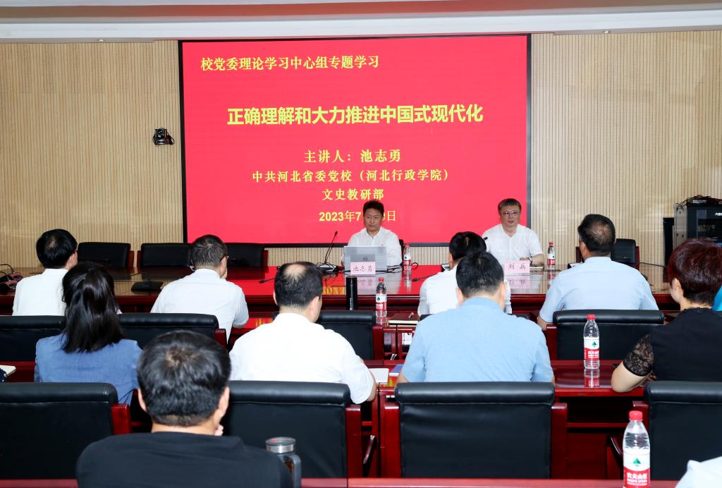 7月10日上午,河北经贸大学校党委理论学习中心组在第五会议室围绕中国式现代化理论开展专题学习,省委党校文史教研部池志勇副教授应邀作辅导报告。校党委书记刘兵主持报告会并讲话,在校校领导参加学习。