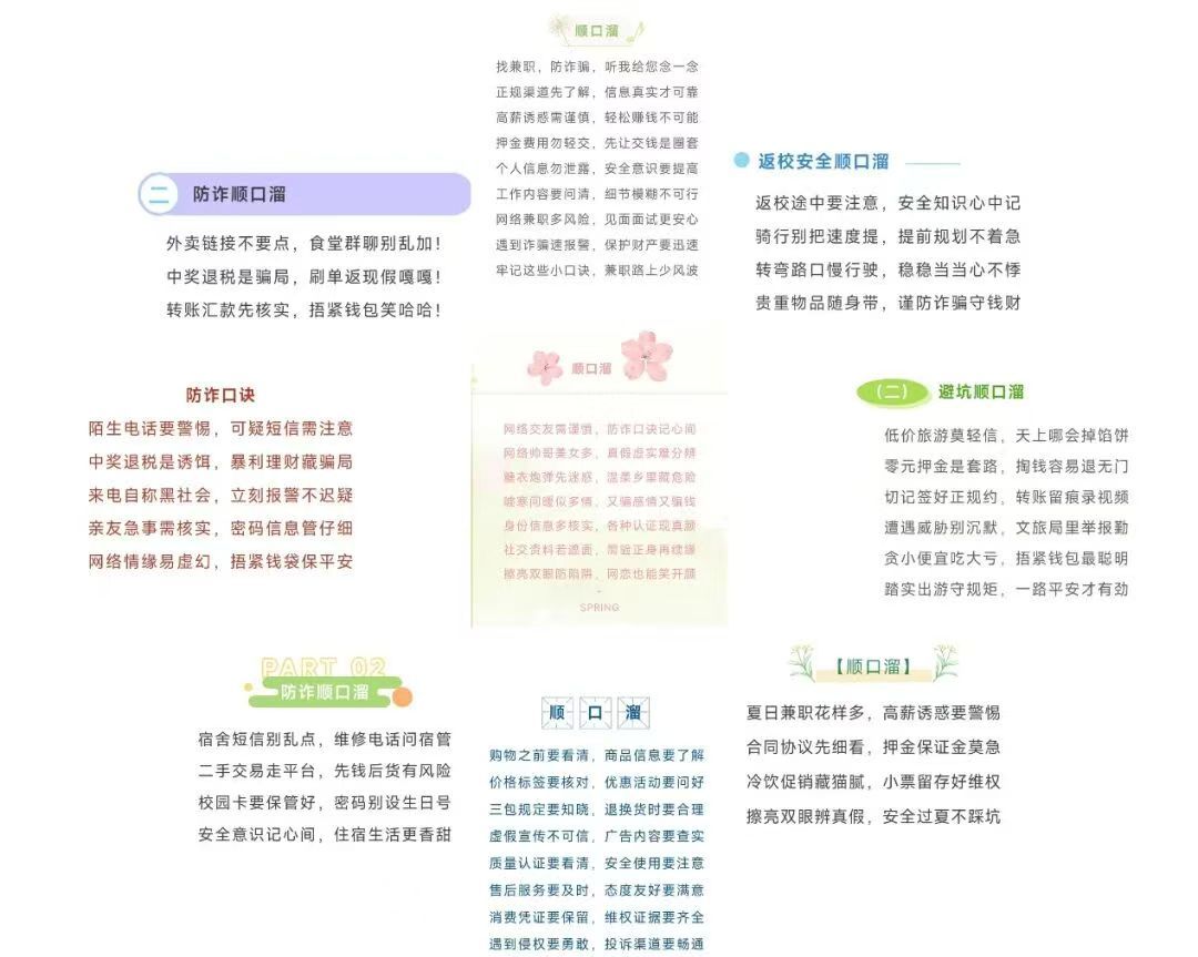 翻开二十四期“权益周报”,每一期都是对学子需求的精准回应。在“本周预告”里,既有国家宪法日的法治解读、考研季的暖心加油,也有“优质服务月”从“吃住行”三端发力的生活指南;“好物分享”模块如同贴心挚友,从冬日保暖的触控手套、夏日降温的挂脖风扇,到整理书桌的迷你收纳架、应对磕碰的急救包,把提升校园幸福感的小物件送到学子身边;“防诈骗小贴士”更是校园安全的坚实防线,针对冒充客服、兼职陷阱、外卖退款骗局等常见风险,用AI生成朗朗上口的顺口溜——“兼职押金勿轻交,先让交钱是圈套”“中奖退税是诱饵,暴利理财藏骗局”,让防范知识变成易记易传的“安全密码”。