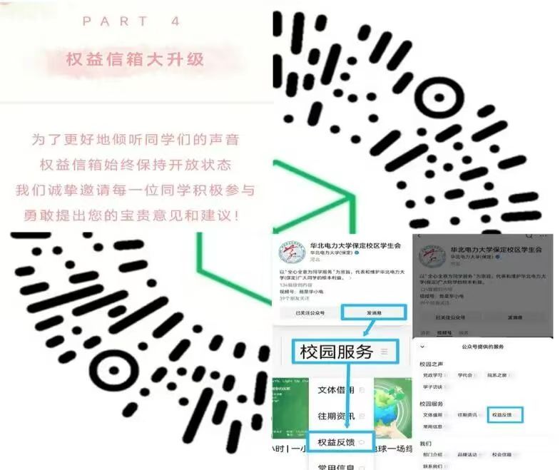 “有困难找权益,有建议投信箱”,早已成为华电学子的共识。周报内嵌的“权益信箱”,通过扫码提交、公众号反馈等低门槛渠道,24小时接收学子诉求。从“十舍六楼洗手间水管损坏”的维修需求,到“教学楼充电插座不足”的设施建议,再到“男生澡堂柜子翻新”的生活关切,每一条反馈都能得到及时跟进。校学生会工作人员会第一时间对接后勤管理处、保卫处等部门,形成“收集-转办-解决-反馈”的闭环机制。如今,校园里规划整齐的电动车停放区、北门新增的智能外卖柜、食堂延长的供餐时间与“大小份”点餐选项,都是“权益信箱”推动问题落地的生动注脚。