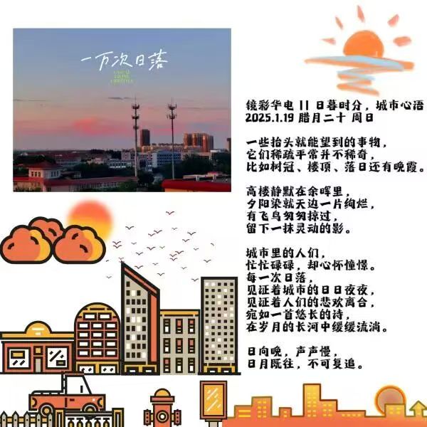 又如,自然景观类图文。创作秉持纪实美学,精准捕捉黄昏天空色彩渐变、亭桥湖景等自然意象,构建兼具浪漫情致与开阔意境的视觉场域。而文字以细腻笔触构建立体叙事网络,借晚风、叶语亦或图书馆剪影,串联岁月历史与青春梦想,将景观之美升华为对校园时光与青春朝气的礼赞。