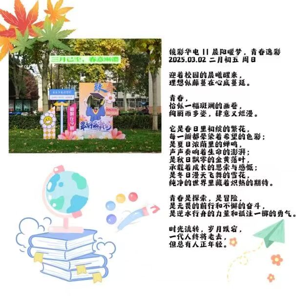 为引导广大学生以艺术视角感知时代发展与校园文化底蕴,在团委(保定)的指导下,校研究生会推出了《镜彩华电》系列精品图文展播。《镜彩华电》系列精品图文,采用开放式创作模式,大学生自愿参加,以“一图一文”的形式在“保定校区研究生会微信公众号”专栏展出。展播图文涵盖校园自然景致、人文历史等多元影像,并搭配细腻的阐释文字对其进行阐述升华,借图文融合的文化新形态,展现华电校园精神内涵与学子青春风采,助力营造富有艺术氛围和文化深度的校园环境。