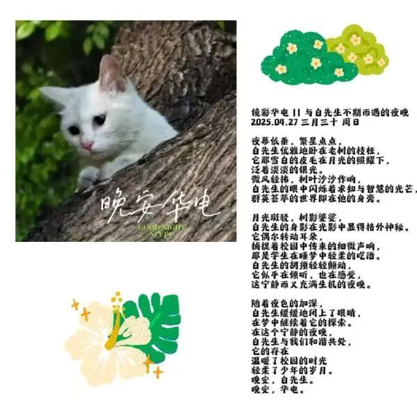 还如,人文生活类图文。融入萌趣元素,以特写镜头定格校园喵星人“白先生”的灵动神态,鲜活展现青春校园蓬勃生机。又以文字赋予其角色意象,用诗意笔触描绘其在夜幕树影间的姿态,从枝桠卧憩的优雅到聆听声响的专注,喵星人动态与校园夜韵、学子气息相互融合,让萌趣生灵成为校园生活诗意与生机的载体,传递出人文温暖与生命活力。