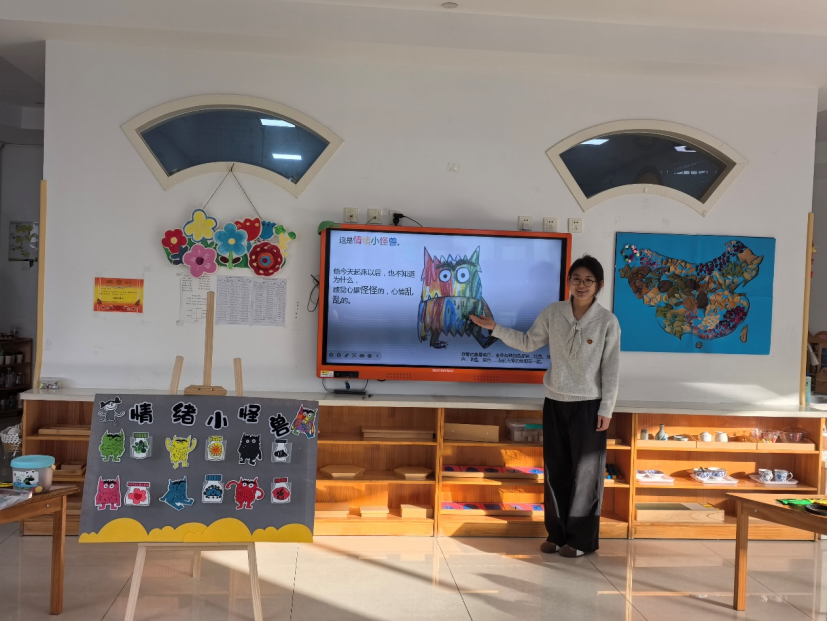 活动以趣味性互动、沉浸式体验等方式,引导幼儿学会认识情绪、表达情绪、管理情绪,让心理健康的种子在孩子们心中生根发芽。 活动伊始,以经典绘本《我的情绪小怪兽》为切入点,通过生动的讲述、形象的肢体动作和色彩鲜明的绘本画面,将抽象的情绪转化为孩子们易懂的“快乐、伤心、生气、害怕、平静”五种具体形态。学院师生化身“情绪引导师”,让孩子们在聆听与想象中初步建立对情绪的认知框架。
