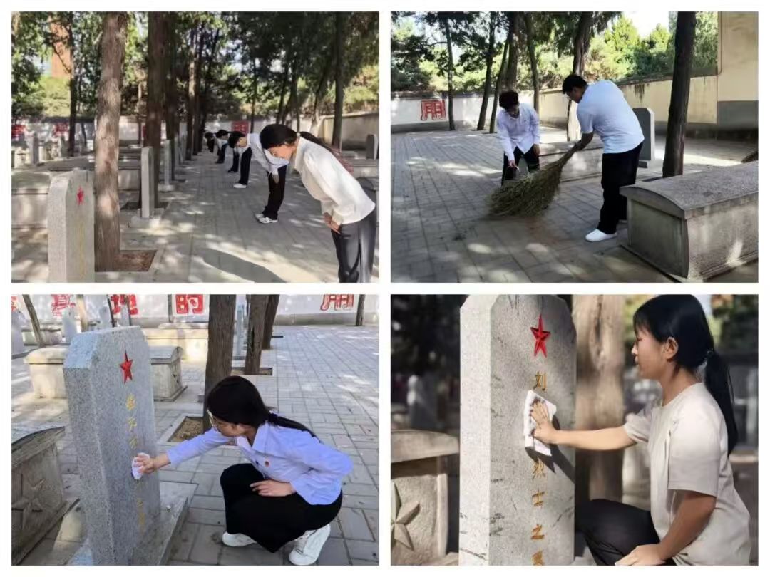 默哀结束后,开展祭扫活动。大家依次走到烈士墓碑前,驻足凝视、鞠躬致敬。大家有序分组,手持扫帚、抹布等清洁工具,认真清扫墓区落叶、杂物,擦拭烈士墓碑。他们轻步走向丰碑,小心翼翼擦拭碑身、拂去尘埃,动作轻柔郑重,不放过任何细节,用实际行动守护先烈安息之地,表达对革命先烈最真挚的敬意与缅怀。