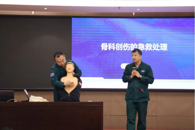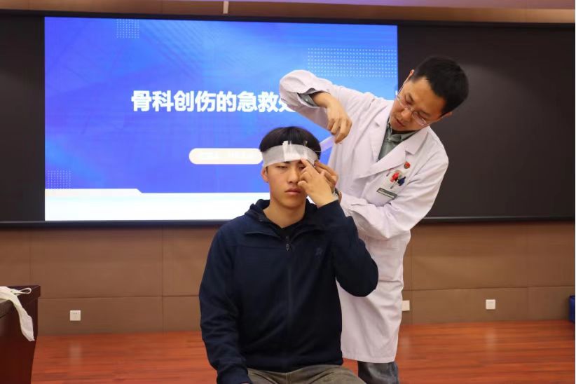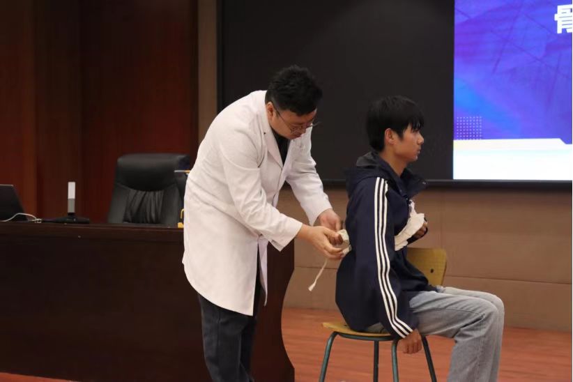关节外科赵吉堂主治医师针对“小腿骨折固定”进行了讲解与实操。他通过模拟在山区环境下的急救场景,指导同学们如何在缺乏专业设备的情况下,利用有限的工具进行有效固定。赵医生详细演示了从判断伤情、检查神经血管功能,到选择夹板、超过关节固定,再到使用棉垫保护骨骼凸起处、包扎固定的完整流程。他还特别提到了在特殊情况下,如何利用“健肢固定”的方法进行搬运,并再次强调了操作前后反复评估伤者神经血管状态的重要性。