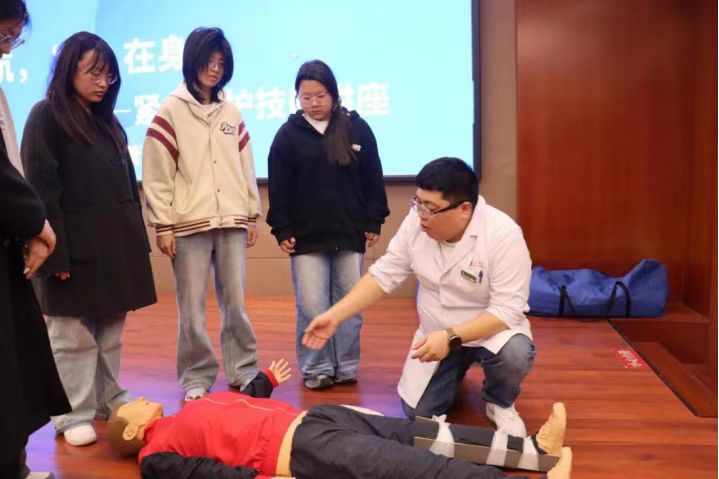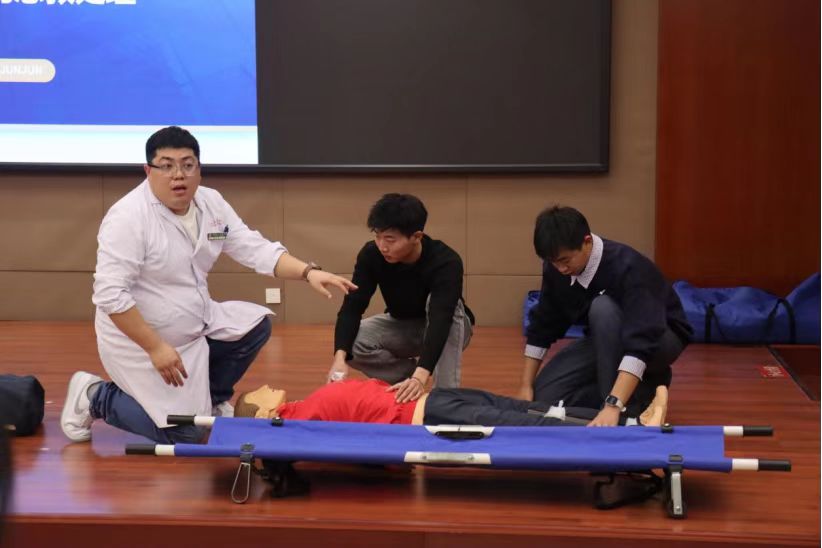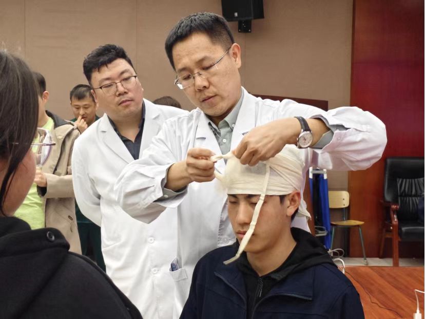 最后,在理论讲解与演示环节结束后,医生们深入学生中间,开展现场一对一指导。同学们踊跃上前,在医生们的耐心指导下,依次进行头部包扎、胸部固定、小腿骨折包扎以及心肺复苏等项目的实际操作练习。医生们仔细观察每一位同学的操作细节,从按压的力度、频率,到包扎的松紧度、敷料的放置位置,逐一进行纠正与示范,并反复强调操作过程中的人文关怀与规范流程。面对同学们提出的各种问题,医生们也结合自身丰富的临床经验,给予耐心细致的解答。现场气氛热烈而有序,同学们在“手把手”的教学中,将理论知识转化为实际操作能力,进一步巩固了所学技能,真正做到了学以致用、学有所获。