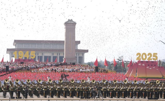 9月3日,纪念中国人民抗日战争暨世界反法西斯战争胜利80周年大会在北京隆重举行。这是纪念大会现场放飞鸽子。新华社记者 陈晔华 摄