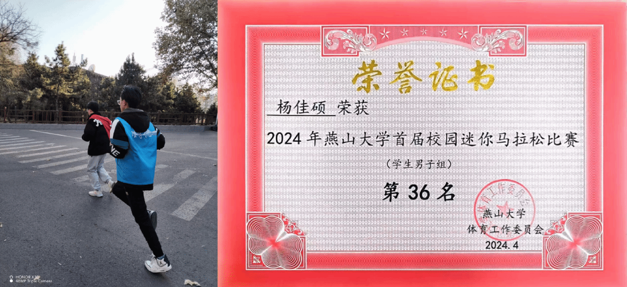 在忙碌的学习之余,杨佳硕同学喜欢在操场中跑步来缓解压力,操场跑道上的每一步,都帮他驱散课业疲惫、放松心情,他积极参与校园各类跑步活动,曾在燕山大学首届校园迷你马拉松比赛中获得男子组第36名;不仅如此,他始终保持规律的体育锻炼习惯,从力量训练到体能提升都认真对待,最终实现体测成绩连续三年达到A+评级,用坚持与自律,以热情与行动力让青春在多元探索中绽放出独特光彩。