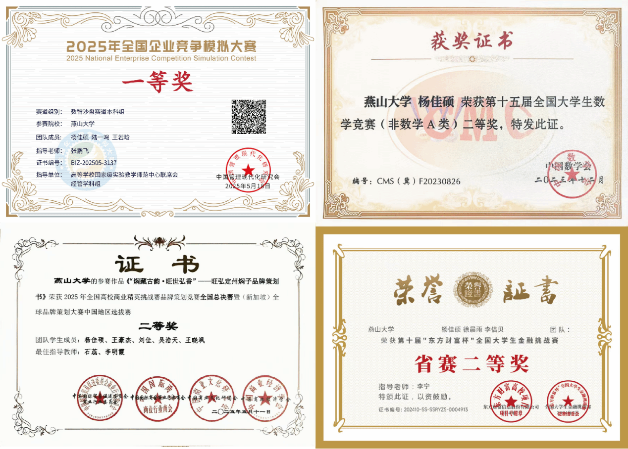 在科研竞赛方面,杨佳硕同学利用课余时间投身基础研究,连续两次担任大创项目负责人并在相关领域发表SCI一篇,曾获得全国企业竞争模拟大赛国家级一等奖、商业精英挑战赛-品牌策划竞赛国家级二等奖、全国大学生数学竞赛省级二等奖等,国家级、省级、校级学科竞赛获奖累计50余项,双创学分已达60分。