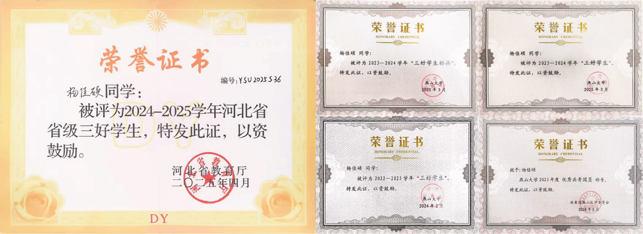 在校期间,杨佳硕同学始终刻苦学习,追求卓越,前后被评为“河北省三好学生”、“燕山大学三好学生”、“燕山大学三好学生标兵”、“燕山大学优秀共青团员”等各项荣誉称号10余项。