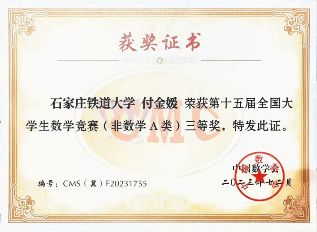 2023年12月获得 第十五届全国大学生数学竞赛(非数学A类)三等奖