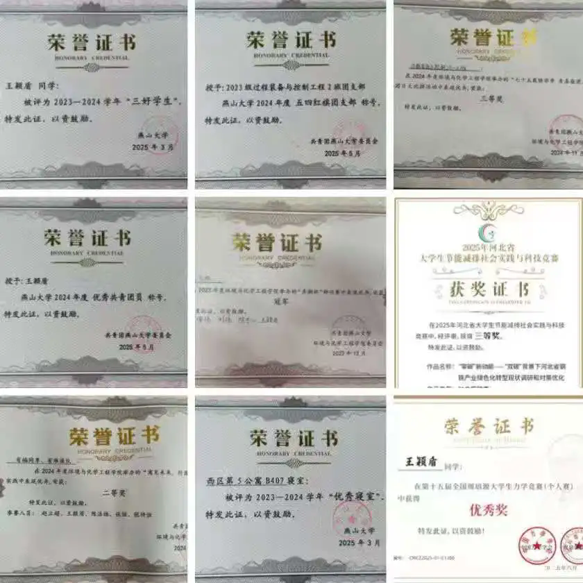 王颖盾同学秉持“以赛促学、全面发展”的理念,在竞赛领域,荣获国家级奖项2项、省级奖项2项、校院级奖项10余项,展现出广泛的兴趣特长与突出的专项能力。凭借学业与竞赛的双重优异表现,他先后三次获得校级一等奖学金、一次校级二等奖学金,成为同学们公认的学习榜样。