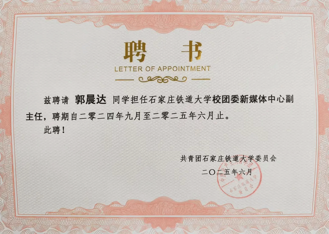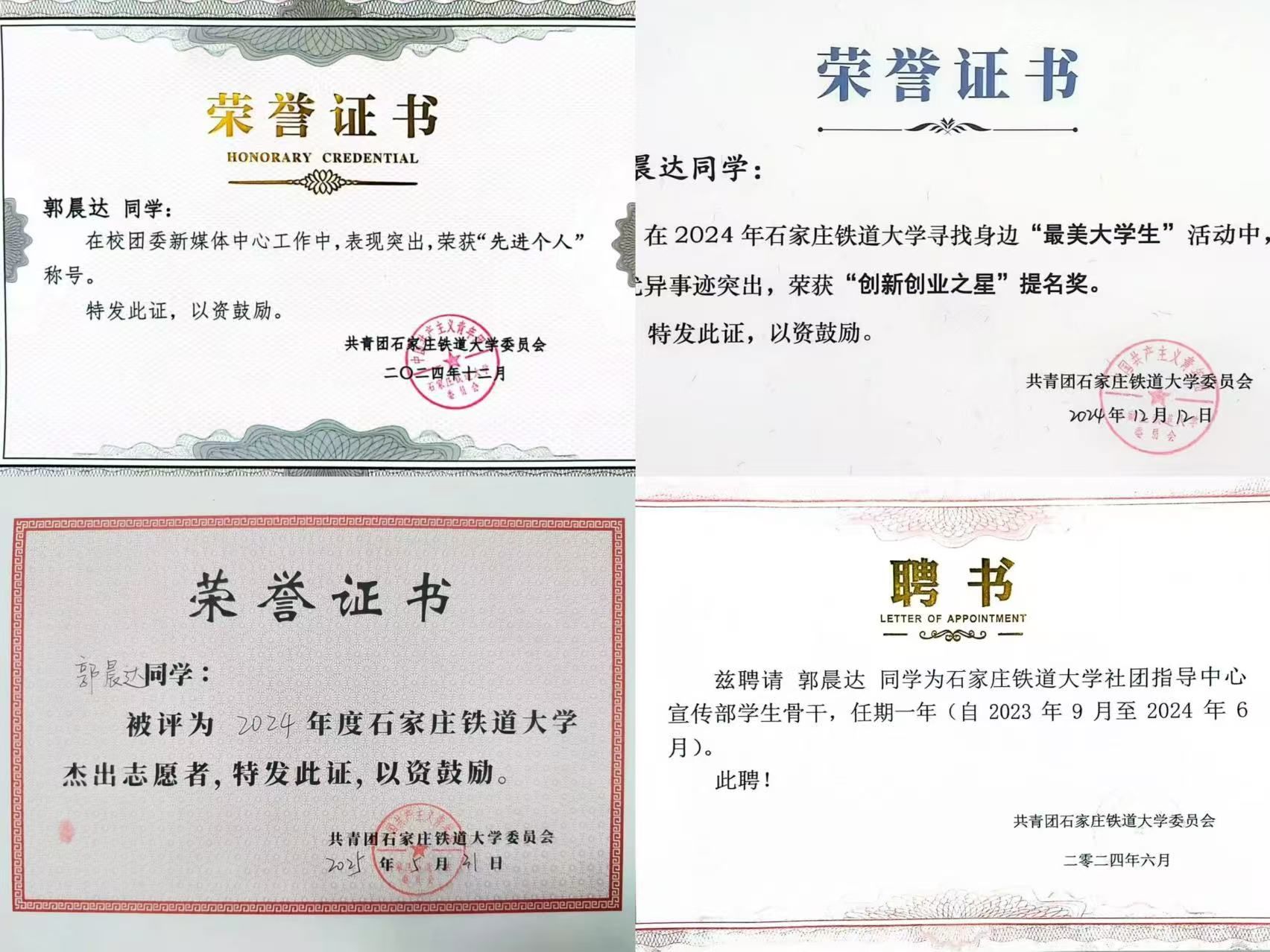 在第六届河北省大学生节能减排社会实践与科技竞赛中,团队凭借扎实的方案与清晰的答辩获得省级二等奖;在2024全国大学生物理实验竞赛中,我们将尖端放电原理转化为科普微视频,从脚本撰写、拍摄剪辑到后期配音,全程自主完成,最终斩获全校第一名,国家优秀奖。此外,我还担任校团委新媒体中心副主任、社团指导中心宣传部部长,负责学校大型活动宣传物料制作与现场管理,累计服务时长超500小时,获评“杰出志愿者”、“先进个人”等荣誉,在服务他人与组织协调中,我的沟通能力与责任担当也得到了极大提升。