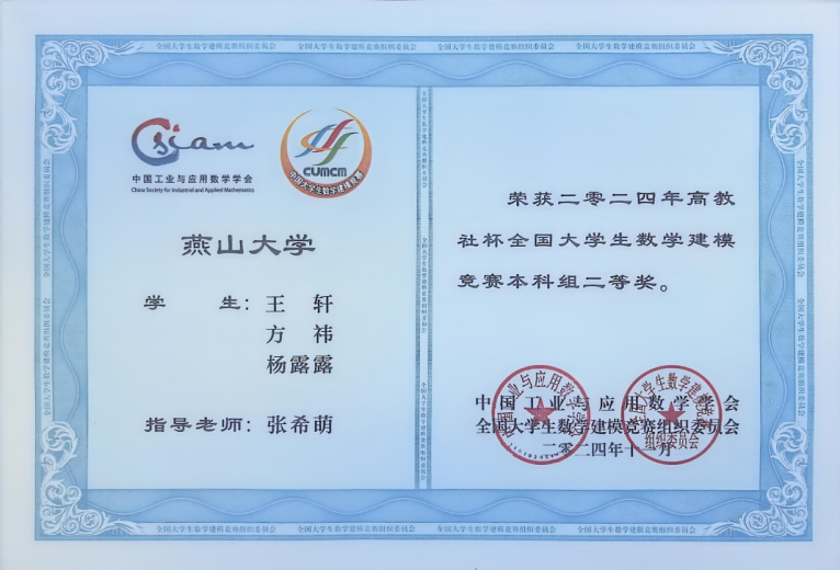 创新是探索的火花,出于对数学的喜爱,他积极投身各类数学学科竞赛。连续两年获大学生数学竞赛省级一等奖,首战获燕山大学非数学A类全校第2名的成绩。在数学建模竞赛中,他作为队长与团队共同高强度奋战,3天赛程仅休息6小时,在此期间是一杯又一杯的咖啡助力,他负责统筹建模与论文撰写,最终带领团队斩获国家级二等奖。这不仅是一张获奖证书,也是这背后付出的艰辛所得到的反馈,更是成长的映照。竞赛之路,本就充满了艰辛,唯有坚持才能拨云见日、化苦为甜。