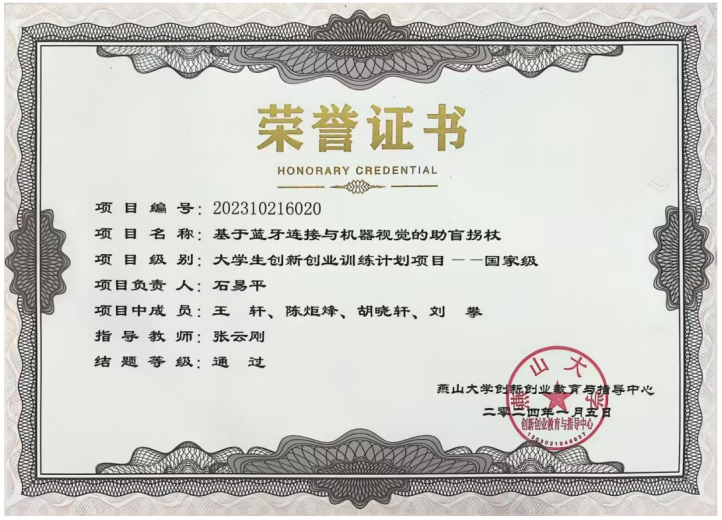 他作为团队核心成员深度参与国家级大创《基于蓝牙连接与机器视觉的助盲拐杖》,运用YOLO算法,基于Jetson Nano平台训练数据集,并将其布署在树莓派上,实现边缘设备的实时监测,识别盲道信息,实现对环境障碍的实时感知与目标识别跟踪。在课程项目中均作为团队负责人,完成相应的任务分配和项目工作整合。