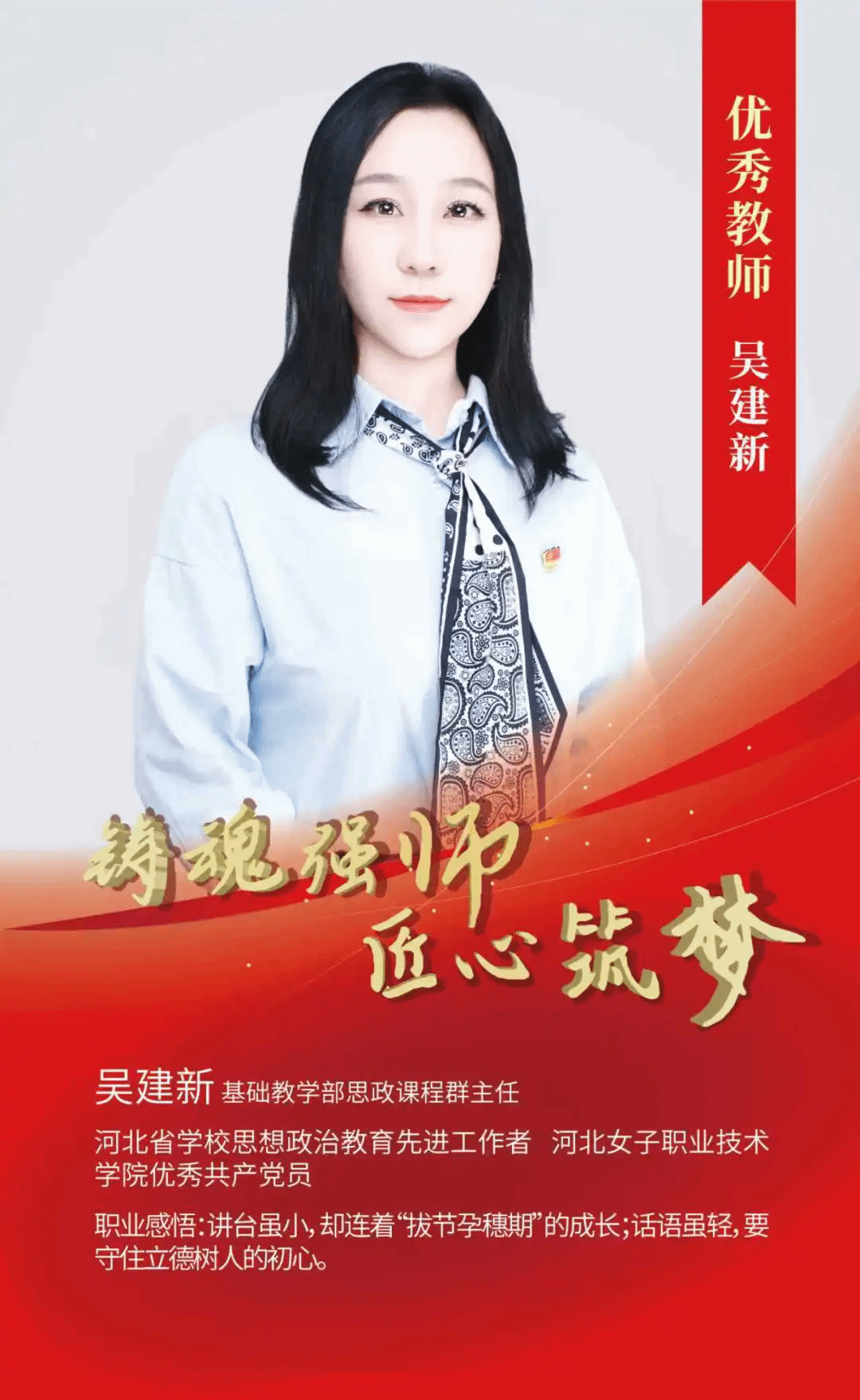 “以教育家精神铸魂强师,谱写教育强国建设华章”。近年来,河北女子职业技术学院教师在专业领域深耕不辍,在各自平凡岗位上用坚守与奉献展现了当代教师的担当与风采。一起走近学院优秀教师,听听他们立德树人、启智润心的动人故事。