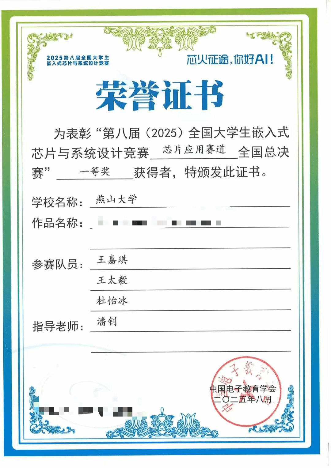 此外他还在2025年全国大学生电子设计竞赛中获得国家级一等奖。他作为队长主要负责项目的硬件、结构与视觉开发工作。负责整车结构的搭建、硬件电路的设计以及YOLO分类模型的部署,显著提升了系统稳定性和可扩展性。最终在功能上可以在2秒内在指定位置姿态下发射激光击中靶心,4秒内在任意位置下识别靶面,并发射激光击中靶心。同时在小车底盘运动过程中可以实时调整并不脱靶,最终在全国总决赛中获得一等奖。