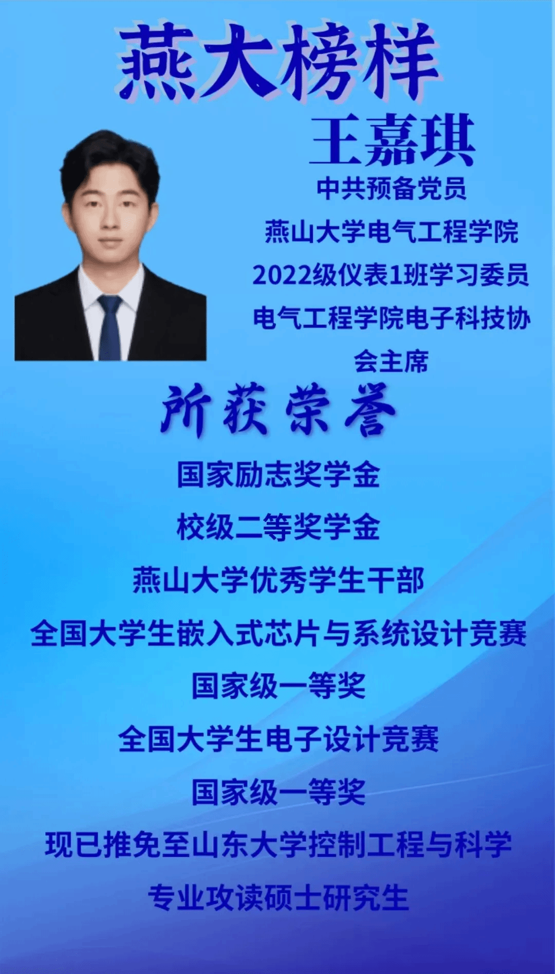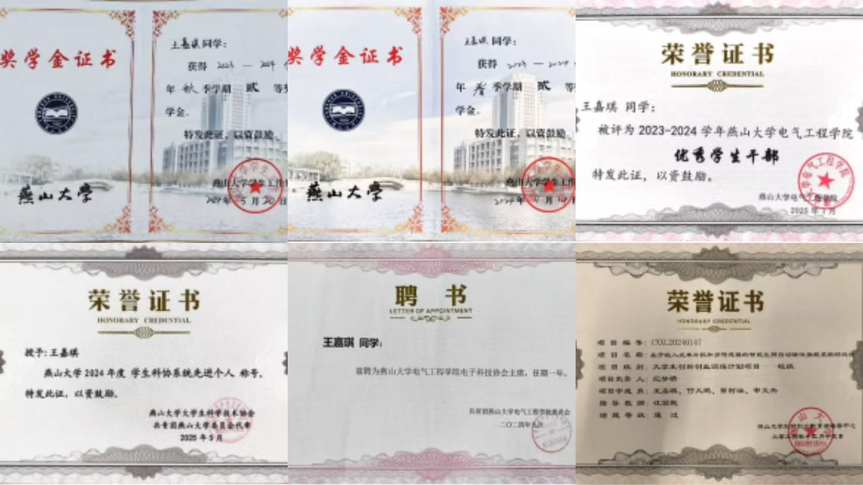 作为电气工程学院2022级仪表1班的学习委员,王嘉琪始终将学业放在首位,用严谨态度深耕专业知识。课堂上,他专注跟随老师思路,及时记录重难点;课后主动梳理知识框架,常与同学探讨电路原理、自动控制等课程的疑难问题,带动班级学习氛围。凭借扎实的积累,他专业成绩始终名列前茅,为后续科创与推免之路打下坚实基础。期间,他还注重理论联系实际,利用课余时间参与实验室基础训练,提前熟悉仪器操作与数据分析方法,逐步培养工程思维。他曾获得国家励志奖学金、校内二等奖学金、校级优秀志愿者校级优秀学生干部等多项荣誉。