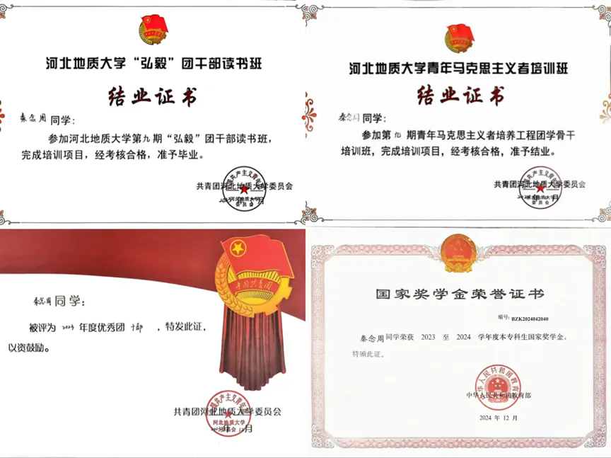 在校期间,她学业成绩稳居前列,实践与竞赛表现亮眼,思想与工作能力同步锤炼:先后参与2023年学校第九期“弘毅”团干部读书班、第十期青年马克思主义者培养工程团学骨干培训班并顺利结业;斩获2022-2023学年、2023-2024学年河北地质大学一等奖学金及2023-2024学年国家奖学金;获评2022-2023学年校级三好学生、优秀学生干部、优秀团干;在2024年第七届全国大学生地质技能竞赛中,一举拿下地质技能综合应用、野外地质技能、地质标本鉴定三项一等奖及地学知识竞赛二等奖,成为资源勘查工程专业学子中的标杆人物。
