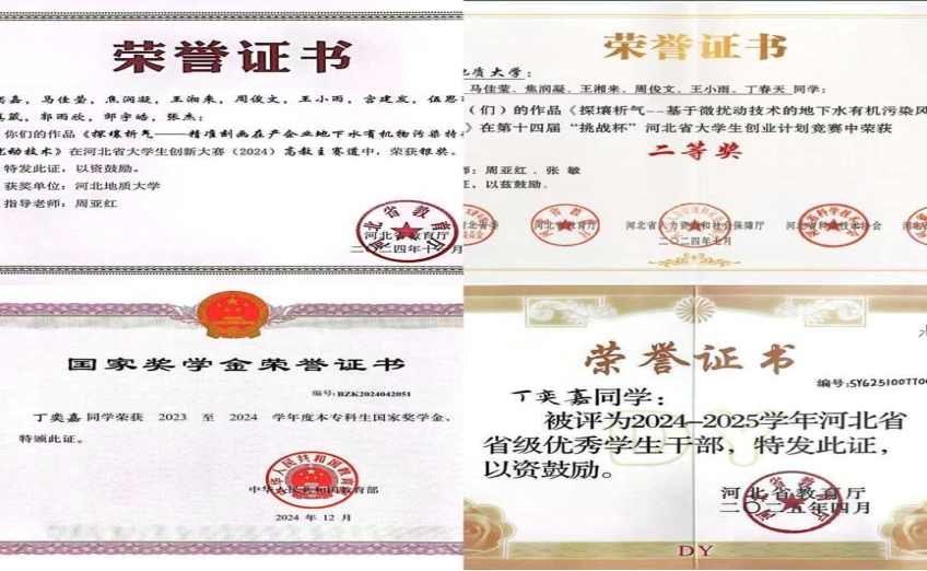 曾获荣誉:国家奖学金、河北省省级优秀学生干部、五四科技创新标兵、2022-2023、2023-2024学年度校级三好学生、2022-2023、2023-2024学年度校级一等奖学金、2022-2023、2023-2024学年度校级优秀学生干部、2022-2023、2023-2024学年度优良学风班班长、2022-2023学年校级优秀团员、2022-2023、2023-2024学年度“三下乡”社会实践先进个人、作为负责人参与了2024年中国国际大学生创新大赛获得省级金奖、2023年中国国际大学生创新大赛获得省级银奖、“挑战杯”大学生创新创业竞赛获得省级二等奖、大学生创新创业训练计划项目获得国家级立项