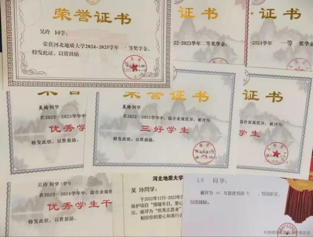 荣获2022-2023学年二等奖学金,2022-2023学年校优秀学生干部,2022-2023学年校三好学生,2023-2024学年校优秀学生干部,2023-2024学年校三好学生,2023-2024学年一等奖学金,2024-2025学年一等奖学金。获得优秀志愿者,年度优秀团员等称号。