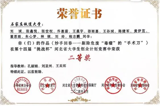 同时,我将此前参与的大创项目进一步转化为竞赛作品,先后在“挑战杯”河北省创业计划竞赛、河北省大学生创新训练项目学术交流活动以及河北省大学生创新竞赛中荣获二等奖。