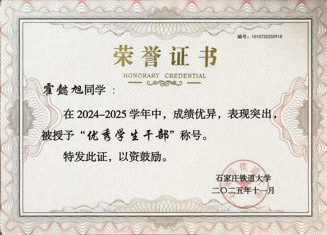 作为一名学生干部,霍懿旭用实际行动践行了“服务同学、奉献集体”的誓言;作为一名新时代青年,他以“勤学、修德、明辨、笃实”的标准严格要求自己。未来,他将继续带着这份初心与担当,在学习的道路上深耕不辍,在服务的征程中砥砺前行,用智慧与汗水书写更加精彩的青春篇章,为学校发展与社会进步贡献自己的青春力量!