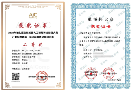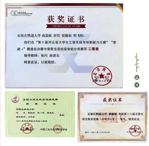 当遇到模型与实际数据不匹配的问题时,他们没有气馁,而是重新梳理思路,查阅数十篇相关文献,尝试调整模型参数、优化算法逻辑,最终在无数次调试后找到最优解决方案,成功斩获省级二等奖与国际二等奖。此后,他又先后挑战全国大学生数学竞赛、河北省工程实践与创新能力大赛等赛事,每一次备赛都是一次全新的突破。为了攻克全国大学生数学竞赛的难题,他刷遍近十年的竞赛真题,总结不同题型的解题思路;为了在睿抗机器人开发者大赛中取得佳绩,他自学AI视觉处理技术,反复调试机器人程序,最终收获全国大学生数学竞赛省级一等奖、睿抗机器人开发者大赛 AI 视觉应用赛国家级一等奖及编程赛道国家级三等奖等多项荣誉,用实力证明了自己的能力。
