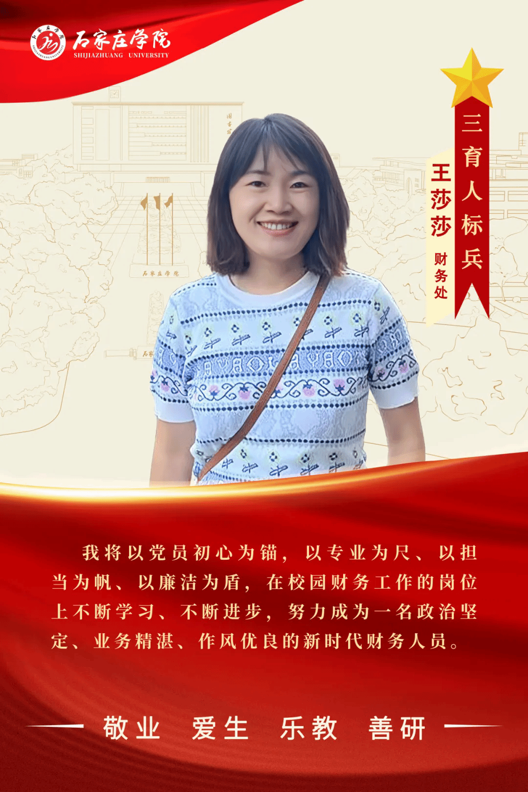 财务工作缜密严谨,容不得丝毫差错。作为财务工作的“新兵”,王莎莎恪尽职守,以高度的敬业精神和责任心主动开展工作。她在平凡的岗位上彰显担当,用自己的实际行动诠释了一名共产党员的初心和使命,为石家庄学院的财务工作有序推进贡献了自己的力量。相信在未来的工作中,她将继续绽放光彩,创造更加辉煌的业绩!
