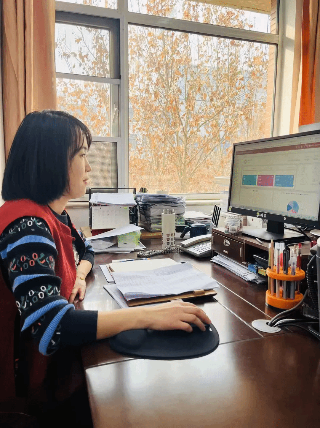 在收费管理工作中,她是一位严谨的“资金守护者”,承担着重要的职责。每年,她经手的学费、住宿费收缴1.2亿元左右,涉及近2万学生、68个专业、18个学院。面对庞大的资金量,她严格执行收支两条线制度,及时足额上缴学费、住宿费及国有资产出租出借等收入至财政专户,守护着学校的资金安全。