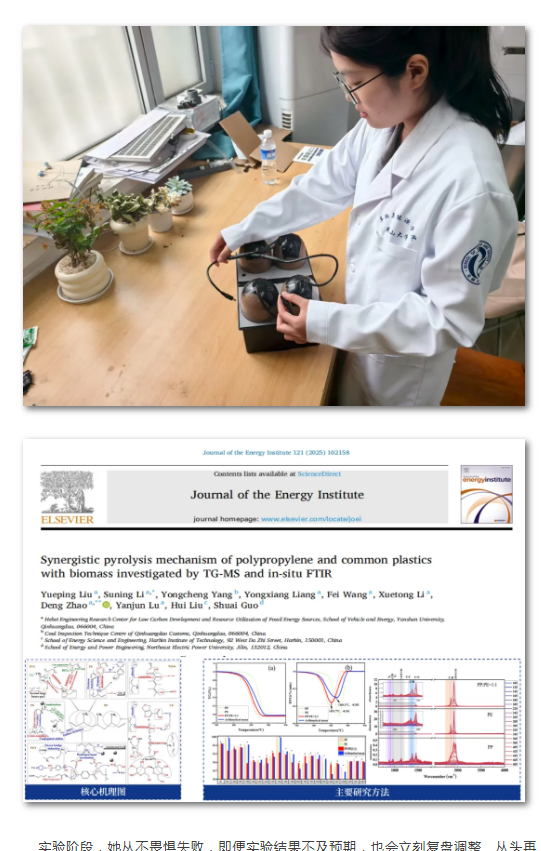 提及科研路,她总笑着说自己只是个踏实的“赶路人”,没什么特别的,不过是比别人多了些坚持、多了些努力。大二时她怀揣着对科研的热情与好奇加入课题组,在导师的悉心指导与师兄师姐的热心帮扶下,一头扎进聚丙烯协同热解的研究世界,为探究聚丙烯与常见塑料及生物质的协同热解机制,她开启了漫长的科研之路。