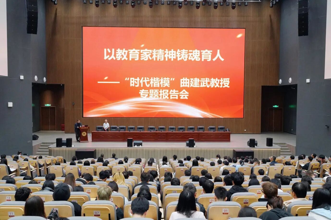 报告会上,曲建武教授结合四十余年坚守思政教育一线的实践经历,围绕“心有大我、至诚报国的理想信念”“言为世先、行为世范的道德情操”等教育家精神的核心要义,以真挚的情感、渊博的学识和自身大量生动案例,深情讲述了自己倾心服务学生、助力学生成长的感人故事。从主动辞去正厅级行政职务重返辅导员岗位,到专门陪伴引导新疆、西藏少数民族学生成长;从设立“励志基金”资助600余名师生,到深入家庭走访关怀学生;从鼓励毕业生扎根边疆、服务祖国需要,到始终践行“一生只做一件事——育人”的坚定信念,曲教授以朴实而深厚的教育情怀,诠释了“仁而爱人”“躬耕教坛、强国有我”的使命担当。