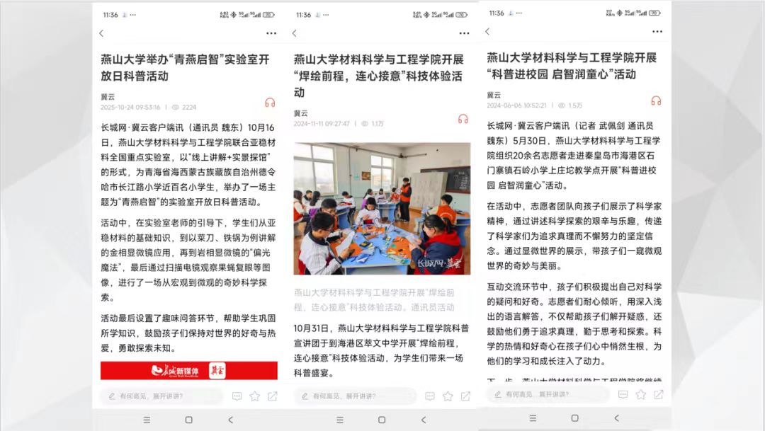 为推动大中小科普一体化进程,自2006年起材料科学与工程学院组建党员“大学生科普团”,定期前往中小学开展“大手拉小手”科创结对活动。亚稳材料国家重点实验室研究生第一党支部积极拓展科普渠道,打造“云端科普课堂”,联动研究生支教团开展材料科学主题科普课程,相关活动获冀云报道。此外,他们还深入各个校园与社区,开展了一系列丰富多彩的科普活动:如走进石岭小学开展“科普进校园,启智润童心”活动,为孩子们打开科学探索的大门;赴萃文中学开展“焊绘前程,连心接意”科技体验活动,让学生们在实践中感受科技的魅力;前往南岭国际社区开展“科学启航 翰墨传情”活动,将科学知识与文化艺术巧妙融合;结对自然家园社区开展“红途童行 科普筑梦”活动,在孩子们心中种下科学的梦想;奔赴兰亭中学开展“学子帮扶育新苗”主题活动,助力青少年成长成才。这些活动得到了河北新闻网、秦皇岛晚报等媒体的广泛关注与报道,充分彰显了科普活动的影响力与传播力。