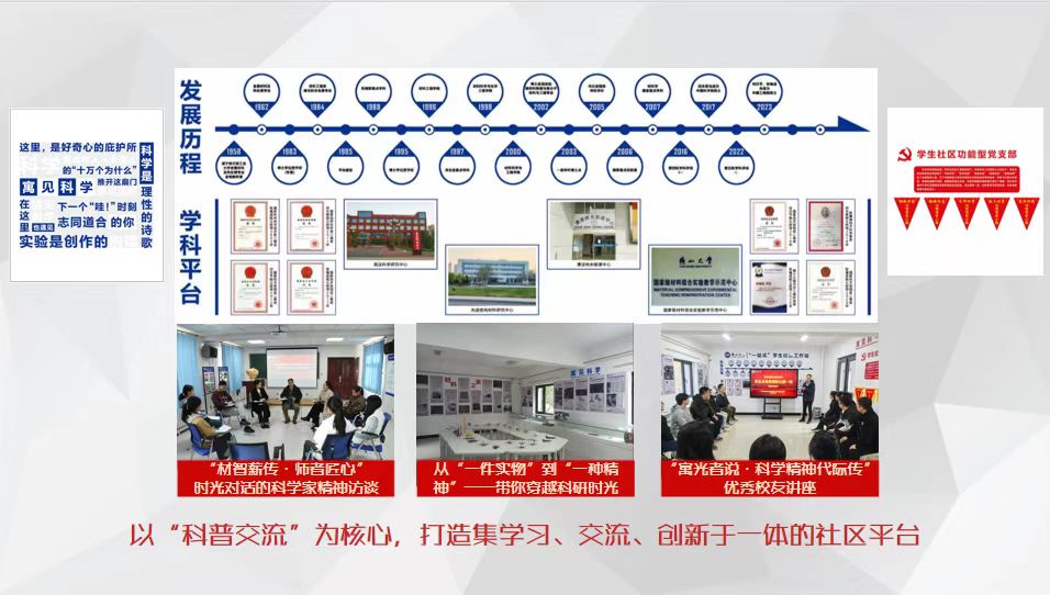 利用燕山大学材料学科的科教资源和技术优势,构建起涵盖“知识学习—成果转化—实践体验”的全链条培育体系。学院建设“寓见科学”一站式学生社区,各学生党支部联动“寓见科学”学生社区功能型党小组打造了一系列“弘扬科学家精神”系列教育主题活动,如亚稳材料国家重点实验室研究生第一党支部举办“材智薪传·师者匠心”与时光对话的科学家精神访谈6期、亚稳材料国家重点实验室研究生第二党支部“寓光者说·科学精神代际传”优秀校友讲座12讲、本科生第一党支部举办“从‘一件实物’到‘一种精神’——带你穿越科研时光”活动等。这些活动形式多样、内容丰富,让青年学子在沉浸式的体验中深刻领悟科学家精神,汲取科普奋进力量。