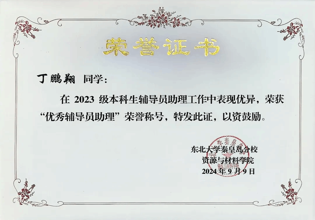 在担任辅导员助理的时候,他也遇到了许多困难。“首先遇到的困难就是电话家访,由于种种原因无法及时与家长或同学取得电话联系。”在这样的情形下,丁鹏翔没有放弃,而是耐心地用短信的方式反复联系大一新生,了解每位新生的实际情况,帮助他们完成开学前的各项准备工作。新生入学后,他积极为同学们解决学习生活中的各类问题,用自己的经验帮助新生们,带领他们克服初入大学时遇到的种种困难。最终,他获得了“优秀辅导员助理”的荣誉称号。