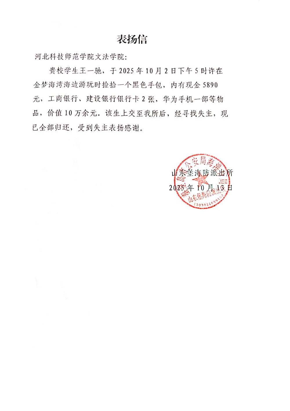 2025年10月15日,河北科技师范学院收到秦皇岛市海港区山东堡海防派出所民警专程送来的一封关于文法学院2022级法学专业学子王一驰拾金不昧的表扬信。对文法学院2022级法学专业学生王一驰拾金不昧的行为予以表彰。