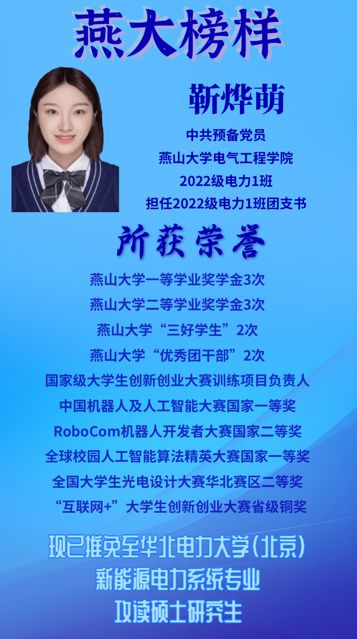 《燕大榜样》栏目第190期,让我们走进“学海领航”系列,跟随电气工程学院的靳烨萌同学,看她以“山高路远”为序,在逐梦途中步履不停;以“春秋几遍”为墨,用坚持与热爱篆刻鲲鹏展翅的滚烫轨迹。