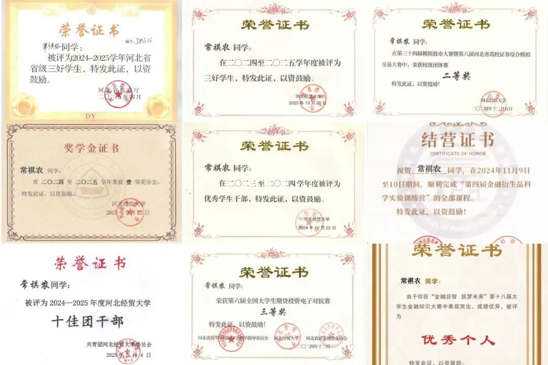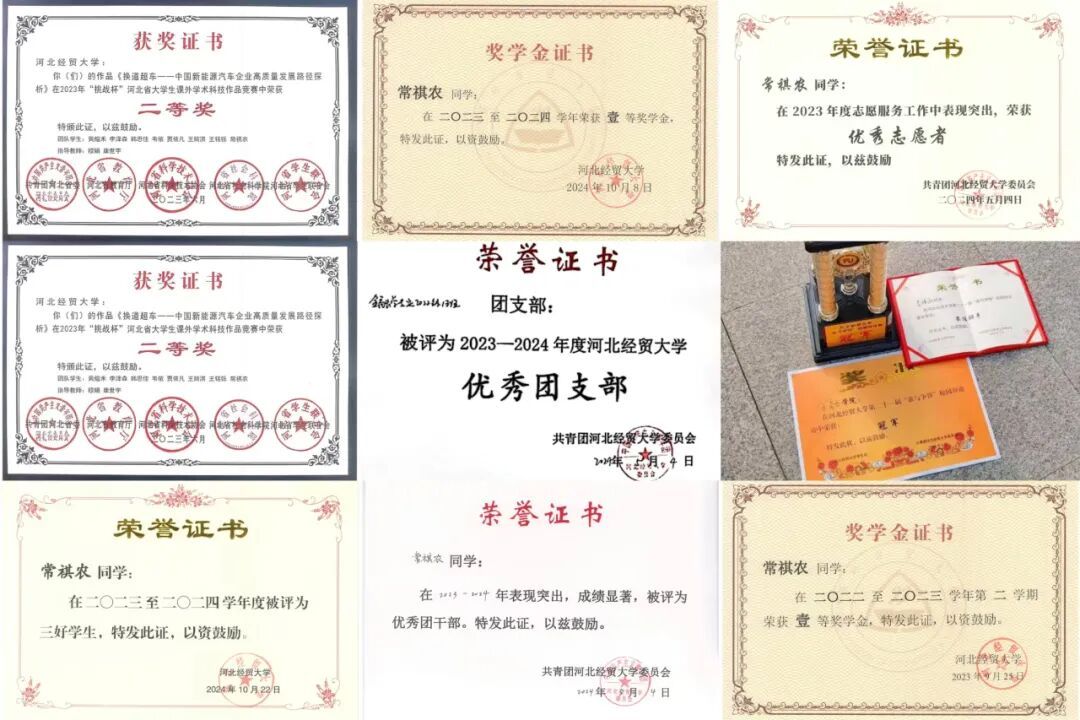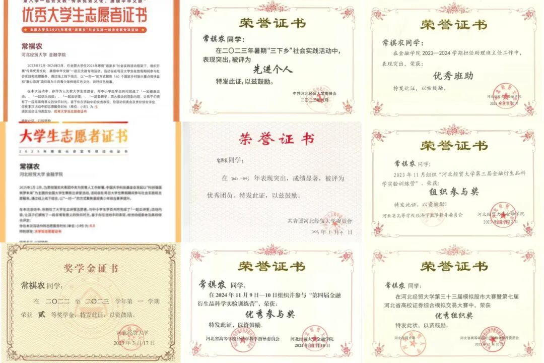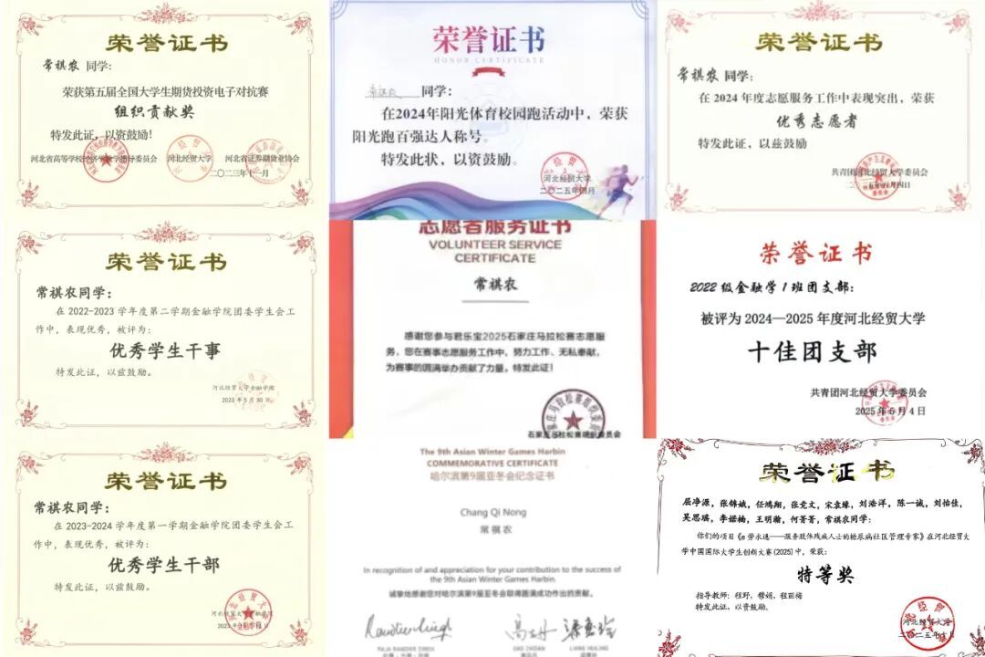常祺农,中共党员,曾任金融学院团委学生副书记,现任金融学专业2022级1班团支部副书记兼学习委员。在校期间,积极参加志愿活动和社会实践,获河北经贸大学暑期“三下乡”社会实践先进个人;积极参加学科竞赛和科研项目,主持省级大创项目一项,获全国大学生期货投资电子对抗赛三等奖。