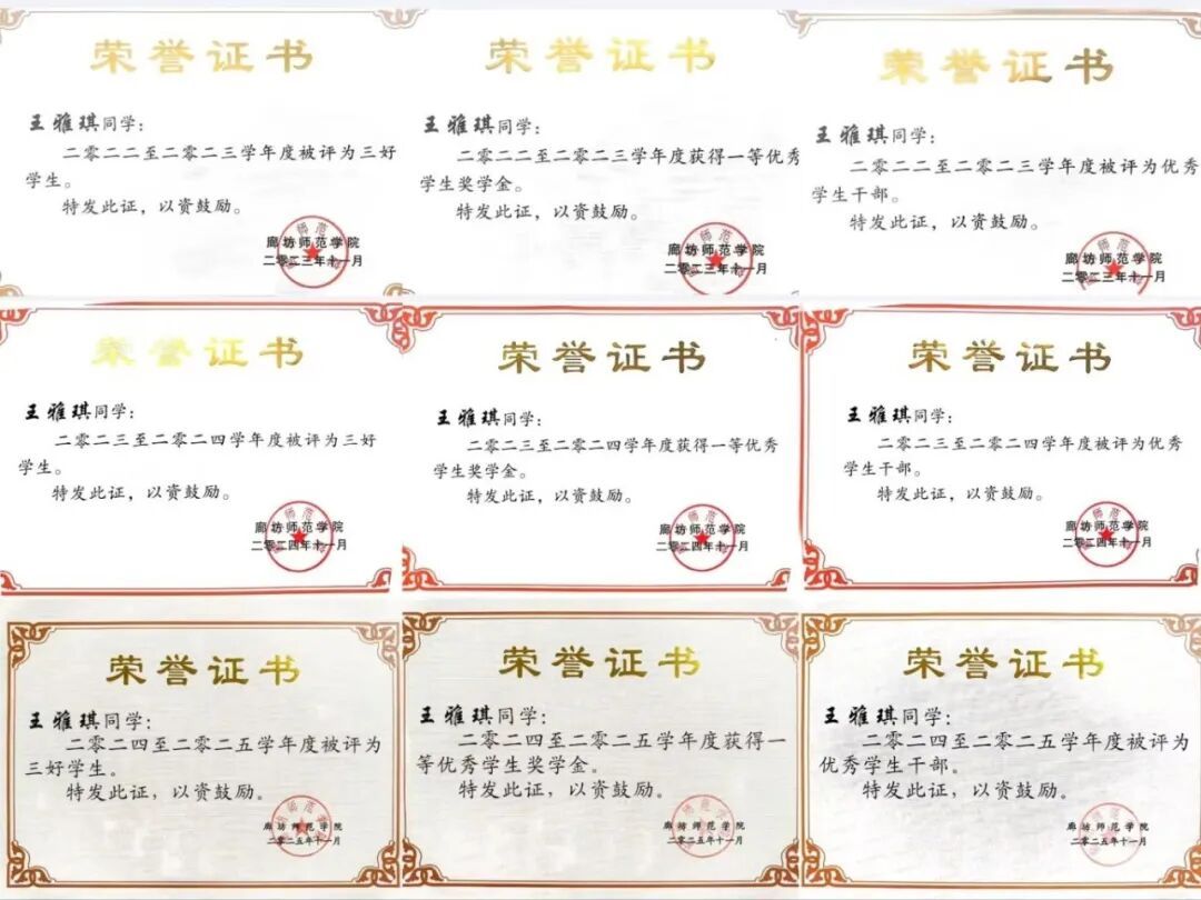 作为学生,王雅琪始终将学习置于首位,深耕专业知识,全面提升综合素质。她的学业成绩稳居班级前10%,连续三年斩获一等奖学金、三好学生与优秀学生干部荣誉,并于2024年荣获国家奖学金;同时取得计算机三级、四级及英语四级证书,为未来发展筑牢根基。