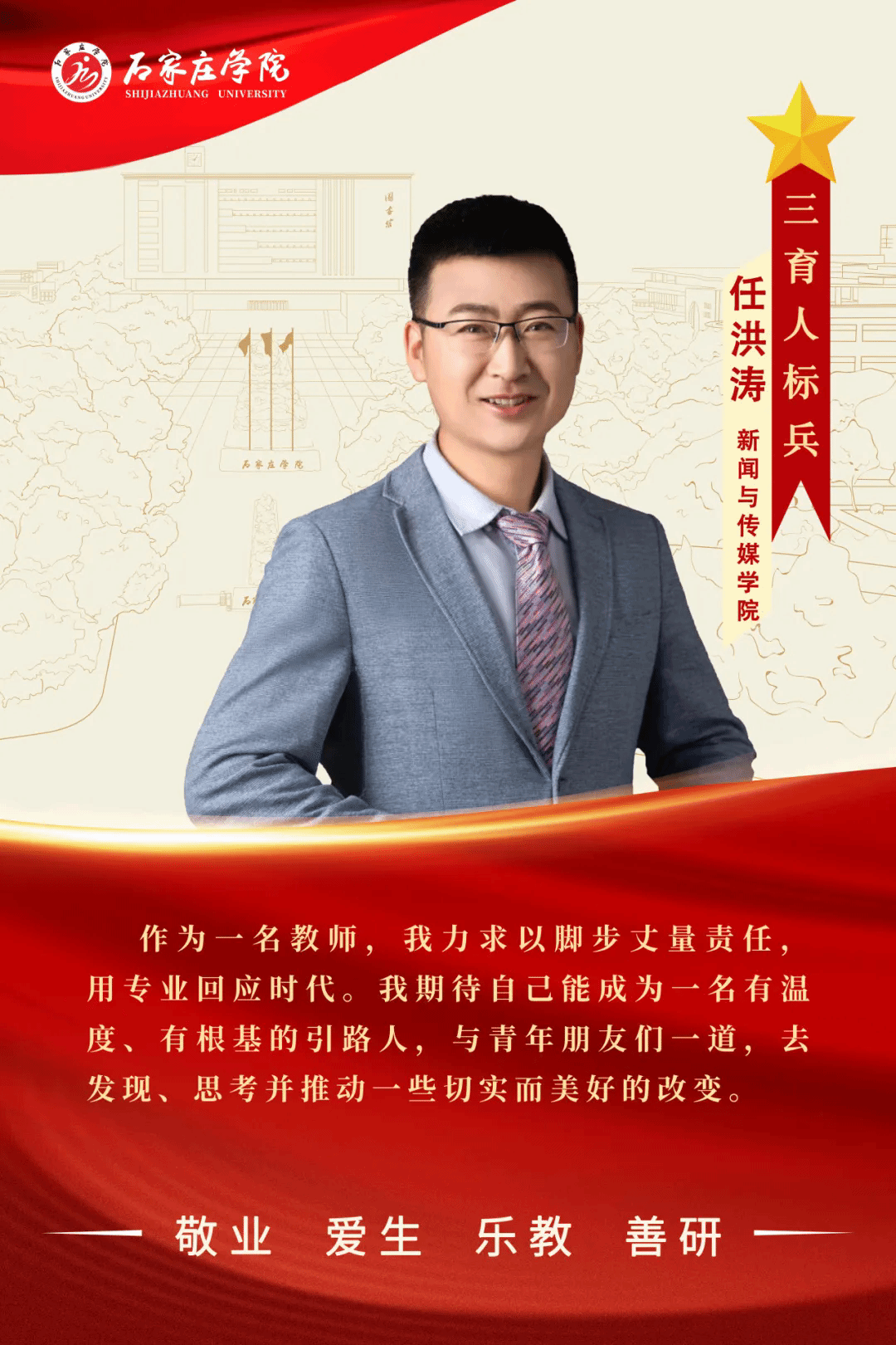 他是执教杏坛的师者,亦是步履不停的行者。从天山脚下到燕赵大地,变的是地理经纬,不变的是育人初心;从三尺讲台到融媒一线,转换的是耕耘场地,不改的是创新热忱;从菁菁校园到广阔社会,调整的是身份角色,秉持的是正声担当。他,就是石家庄学院新闻与传媒学院教师任洪涛——一位扎根实践、行走不息的育人者。