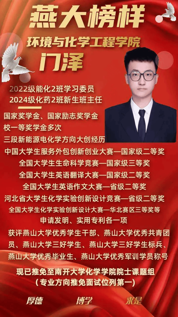“在坚冰还盖着北海的时候,我看到了怒放的梅花”,这句毛泽东主席对自己早年在北京生活的描述,始终是鼓舞门泽前行的力量。于他而言,这朵凌寒盛开的梅花,是图书馆深夜不熄的灯火下,他伏案攻克难题时的执着求知;是实验室里,他反复打磨、调试材料时的一丝不苟;更是身为学习委员,为同学答疑解惑时的耐心细致,作为新生班主任,引导新生锚定方向时的热忱担当。