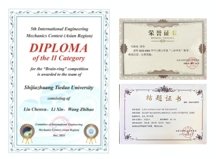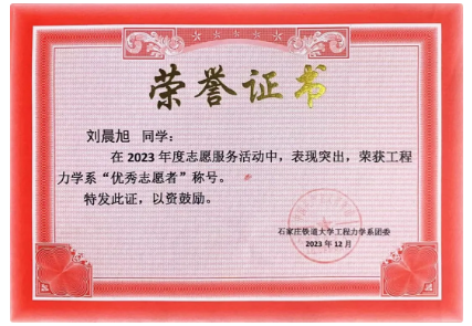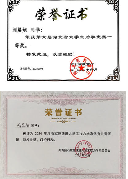 课后的空闲时光,我从未停下脚步:要么泡在图书馆深耕专业书籍,啃下一本本晦涩的力学教材;要么扎进学科竞赛的备赛中,和队友们熬夜讨论方案、反复推演模型;要么走进社区践行志愿初心,在服务他人中锤炼责任与担当。这份“日复一日的认真”,让我在学业与实践中双向成长:不仅交出了亮眼的绩点答卷,更在赛场中屡获佳绩——斩获河北省力学竞赛个人赛一等奖、团体赛一等奖,拿下周培源力学竞赛国家三等奖、河北赛区一等奖,跻身国际大学生工程力学竞赛二等奖,还凭借持续的志愿付出获评市级优秀志愿者。没有一蹴而就的成功,只是把“做好当下”当成习惯,让每一份投入都沉淀为成长的底气。