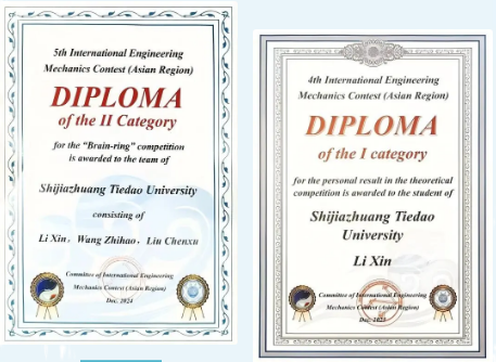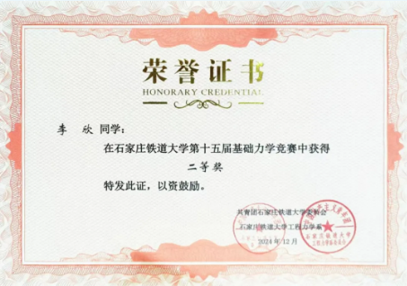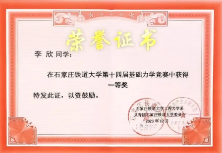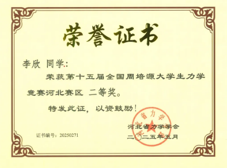 这份兴趣,慢慢变成了我生活里的“惯性”:大二抱着“试试水”的心态参加国际大学生工程力学竞赛,凭着课上学的理论和自己攒的解题思路,拿了个人赛一等奖;大三和同学组队再参赛,啃下更复杂的团队协作题,得了团队赛二等奖,同期还拿了河北省力学竞赛三等奖;到大四冲周培源力学竞赛,哪怕备赛时正赶上大创项目的关键期,最后拿到了省二等奖。这些奖项说起来像“成果”,但对我而言,更像是每一次和力学“交手”后,它给我的“反馈”——毕竟,琢磨明白一个复杂的力学模型,可比拿奖本身让我开心多了。