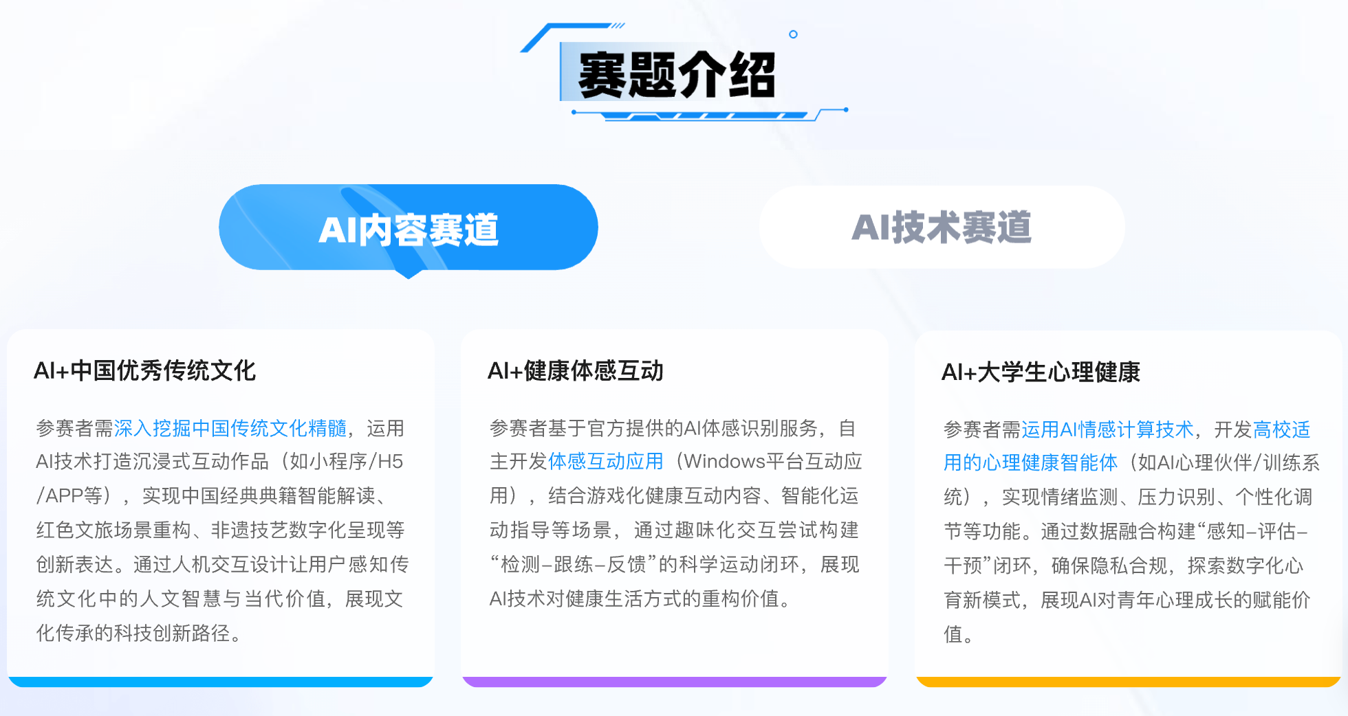 由全国高校思想政治工作网、南开大学、中国移动联合主办的“动感地带AI+高校创智计划”大赛来啦~ 了解赛事详情请戳:https://www.migufun.com/5gcampus/?pageId=102003 图片1 赛程安排 图片2 两大赛道 图片3 评审标准 图片4 奖励机制 敢用、会用、善用人工智能的你,是否已经心动了呢~快来大显身手吧!