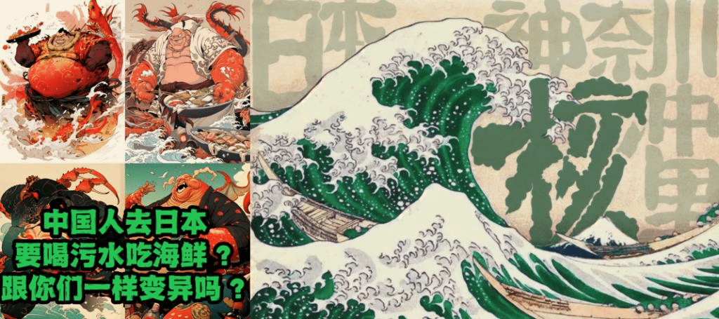 “AI时政热点”栏目主要以AIGC图片形式表达作者对社会热点新闻的观点,在8月24日日本政府宣布排放核污水后,连续从海洋末世景象、海洋生物变异、楚楚可怜的海洋小动物、《神奈川冲·核里》名画二创等几个创作选题发布AIGC作品,引发人们关注和思考;在8月29日日本政客调侃中国游客去日本必须喝核污水、吃福岛海鲜才能入境时,AI绘制日本人喝核污水、吃变异海鲜引发身体变异的系列海报,调侃的发出“难道要让我们也变异成你们这样吗?”的质问,在网络上发挥了一定的正向引导作用(见图4)。